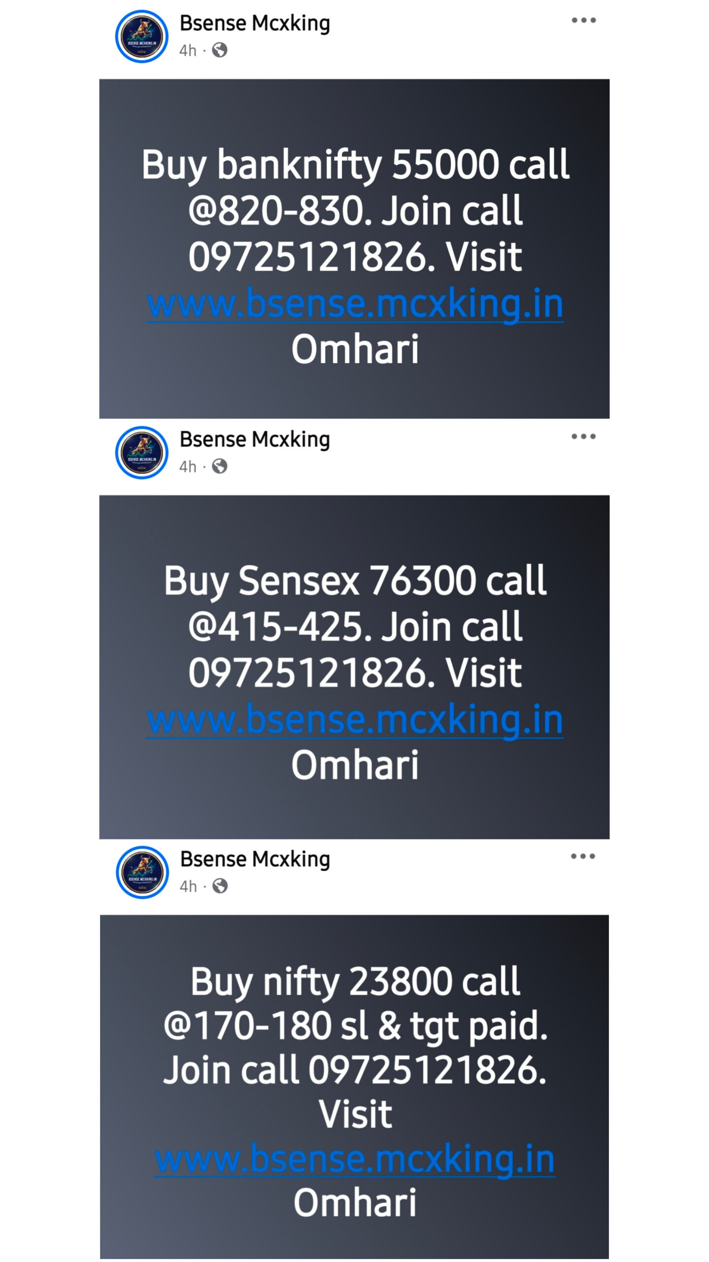 Today’s Nifty, Banknifty, Sensex call put options performance: we given here Buy Bank Nifty 55000 call @820-830, made high 1207. Sensex 76300 call bought @415-425 made high 811 & Nifty 23800 call bought @170-180 made high 251. Made bumper profit in index call put options. No.1 nifty banknifty & sensex futures & call put options tips provider. 99% sure shot. Call@09725121826. Visit www.bsense.mcxking.in Omhari